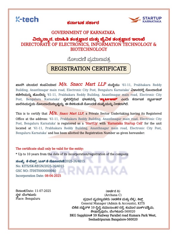 - Snacc Mart is Officially Recognized as a Karnataka Startup!by Apsara SureshSnacc Mart LLP has officially registered as a startup under Karnataka’s Startup initiative, receiving its certificate on July 11, 2025. This recognition enhances its access to mentorship, funding, and opportunities for collaboration. Snacc Mart aims to expand its digital reach, innovate healthier snacks, and improve sustainability, transforming the snacking experience.